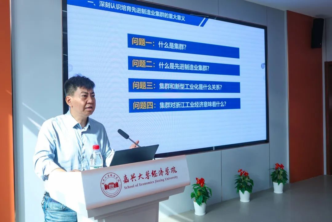 开班仪式后,上午场培训由浙江省工业和信息化研究院区域经济研究所所长赵立龙主讲。赵所长围绕《浙江省“415X”先进制造业集群建设与升级发展》这一主题,阐释了先进制造业集群培育的重大意义,从八个重点产业集群角度解读了先进制造业集群体系架构,并对未来制造业集群智能化、高端化和绿色化升级发展进行了详细分析。
